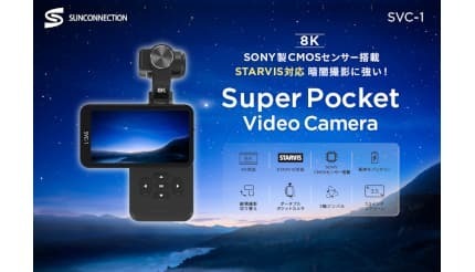 ソニー製のSTARVIS対応CMOS搭載&元オリンパスのエンジニア設計によるビデオカメラがクラファン実施中 サンコネクションは10月15日〜11月18日の期間、ソニー製のSTARVIS対応CMOSを搭載し、元オリンパスのエンジニアが本体設計を担当した、「スーパーポケットビデオカメラ SVC-1」のクラウドファンディングを、クラウドファンディングサイト「Campfire」にて実施している。
