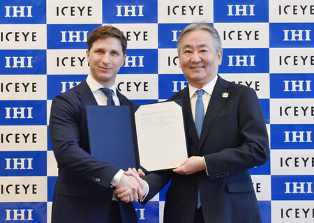 「衛星コンステレーション」に関する契約を締結したIHIの井手博社長(右)とICEYE(アイサイ)のラファル・モドジェフスキ最高経営責任者(CEO)=16日午後、東京都江東区 IHIは16日、フィンランドの地球観測衛星メーカー「ICEYE(アイサイ)」と、高精度データの提供が可能な同社製衛星を調達する契約を締結した。多数の小型衛星を展開して目標を探知する「衛星コンステレーション」を構築・運用し、日本の防衛や安全保障強化に役立てる。