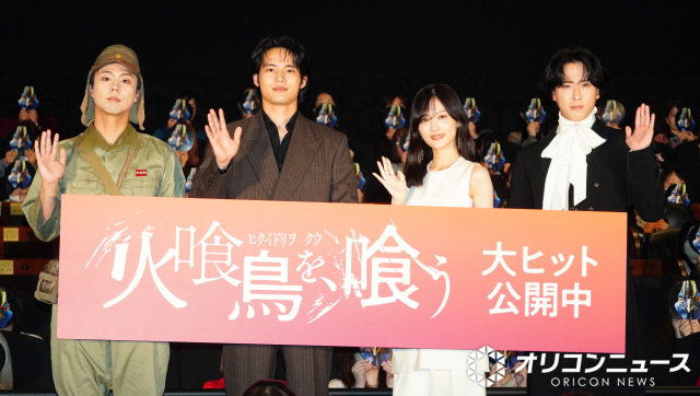 映画『火喰鳥を、喰う』大ヒット御礼あいさつに登壇した(左から)小野塚勇人、山下美月、水上恒司、宮舘涼太 (C)ORICON NewS inc. 俳優の水上恒司、山下美月、9人組グループ・Snow Manの宮舘涼太が16日、都内で行われた映画『火喰鳥を、喰う』大ヒット御礼舞台あいさつに登壇。本作のオーディオコメンタリーの収録を振り返った。