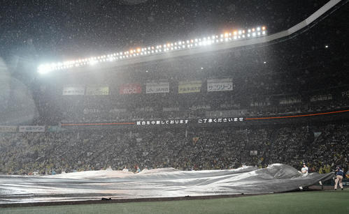 阪神園芸の尽力もあり、豪雨による中断から試合が再開された。5回表終了時点の、午後7時40分に強い雨が降り始めて試合が中断。ものの数分で内野全域への巨大シートが設置された。