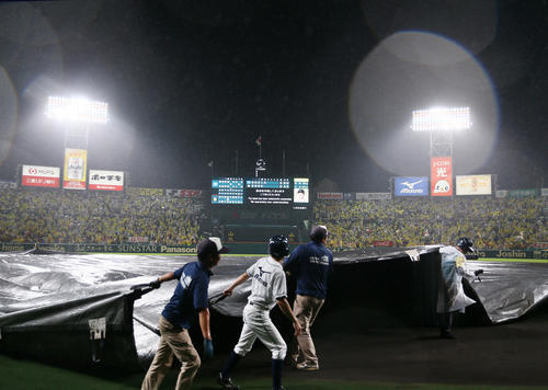 5回裏の阪神の攻撃前に突然の降雨で試合が中断した。阪神園芸が巨大な防水シートを、あっという間に内野に敷く早ワザを披露すると、場内の観客から大きな拍手が起こった。雨が弱まると今度は試合再開に向けて再始動。絶妙な連係プレーでシートを巻き上げ、吸水ローラーも使ってグラウンドを整備。中断時間を47分にとどめた。