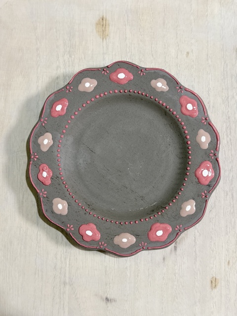 最初にsiro/iroさんが公開したのは焼く前のお皿の画像。グレー地にアイシングのようなぷっくりとしたイラストが描かれているデザインで、色違いの花が交互に描かれたものと花の一部がうさぎになってグリーンが添えられているものの2種類となっています。