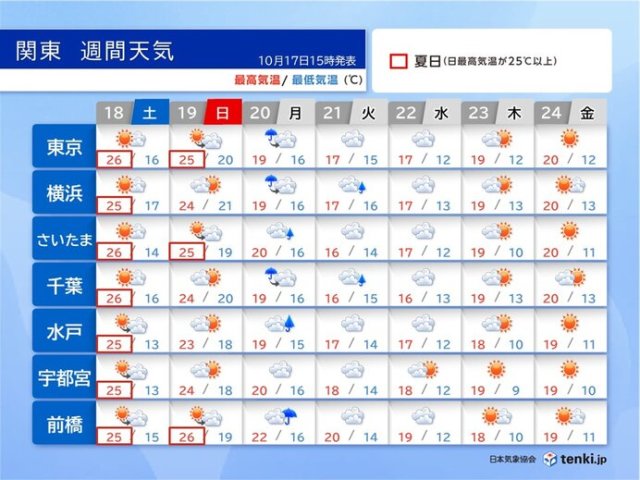 その先、21日以降は天気が回復に向かい、晴れのエリアが次第に広がります。それでも、日中の気温は20℃に届かないでしょう。朝晩の気温は、東京都心をはじめ、南部は12℃前後で、宇都宮など北部では10℃を下回る所もありそうです。