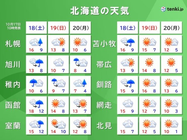 ÌÀÆü18Æü¤ÏÆ»Æâ¤Ç¹¤¯±«¤¬¹ß¤ê¡¢±«¤Î¸å¤Ë¤ÏË̳¤Æ»¤Î¾å¶õ¤Ë¶¯¤¤´¨µ¤¤¬Î®¤ì¹þ¤ß¤Þ¤¹¡£ÌÀ¸åÆü19ÆüÌ뤫¤é¤Ï¡¢Æ»Ë̤䥪¥Û¡¼¥Ä¥¯³¤Â¦¤Çɸ¹â¤Î¹â¤¤Æ½¤ä»³´ÖÉô¤òÃæ¿´¤ËÀ㤬¹ß¤ê¡¢20Æü·îÍËÆü°Ê¹ß¤ÏÊ¿ÃϤǤâÀÑÀã¾õÂ֤Ȥʤ뤪¤½¤ì¤¬¤¢¤ê¤Þ¤¹¡£¤Þ¤¿³ÆÃϤǴ¨¤µ¤â¶¯¤Þ¤ê¡¢·îÍËÆü¤ÏºÇÄ㵤²¹¤Ï¹¤¯5¡î°Ê²¼¤È¤Ê¤ë¤Ç¤·¤ç¤¦¡£¤³¤Î´¨µ¤¤Ï24Æü¶âÍËÆüº¢¤Þ¤ÇË̳¤Æ»ÉÕ¶á¤ËµïºÂ¤ê¡¢Æ»ËÌ¤äÆ»ÅìÊýÌÌ¤ÎÆâΦ¤Ç¤ÏɹÅÀ²¼¤È¤Ê¤ëÆü¤â¤¢¤ë¸«¹þ¤ß¤Ç¤¹¡£º£½µËö¤Î¤¦¤Á¤Ë¡¢Åßʪ¤Î¥³¡¼¥È¤ä¥Þ¥Õ¥é¡¼¤Ê¤É¤Î½àÈ÷¤ò¿Ê¤á¤Æ¤ª¤¯¤È¤è¤µ¤½¤¦¤Ç¤¹¡£