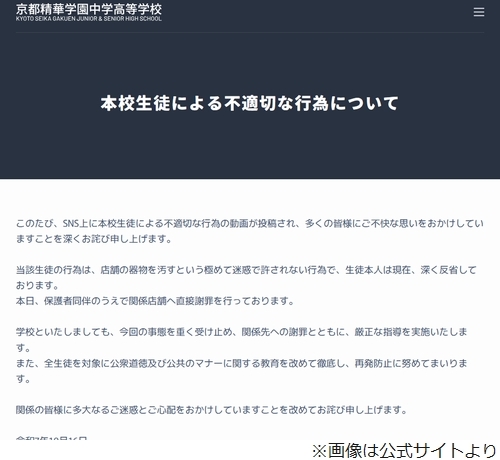 京都精華学園高等学校は10月16日、「SNS上に本校生徒による不適切な行為の動画が投稿され、多くの皆様にご不快な思いをおかけしていますことを深くお詫び申し上げます」と、公式サイトで謝罪した。