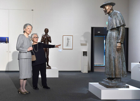 皇后時代に「舟越保武彫刻展」を鑑賞される上皇后さまに作品を説明する末盛千枝子さん=2015年8月、東京都練馬区の練馬区立美術館 上皇さまを支えたいとリハビリに励み、ほぼ大腿(だいたい)骨骨折前の状態まで回復された上皇后さま。児童文学を通じ、長年親交がある絵本編集者の末盛千枝子さん(84)=岩手県八幡平市=は、退院から間もない上皇后さまと再会を果たした。リハビリ中の上皇后さまと、末盛さんの車椅子2台が隣り合わせで並び、思い出話に花を咲かせた。末盛さんが痛みを尋ねると、上皇后さまは「大丈夫」と応じ、元気な様子だったという。