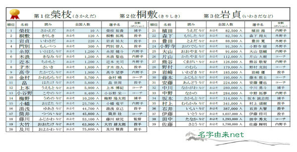 第1位となったは、高知県の出身の「榮枝 裕貴(さかえだ ゆうき)」 捕手だった。全国人数およそ10人の珍しい名字で、奈良県や高知県にみられる。