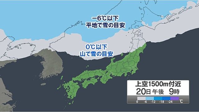 明日21日(火)にかけて、北海道の上空1500メートル付近でマイナス6℃以下の強い寒気が流れ込むでしょう。平地でも降れば雪になるような冷たい空気です。日中は雨に変わっても、今日の夜から明日21日(火)朝にかけては再び雪が降り、路面の状態がさらに悪くなる所も出てくるでしょう。