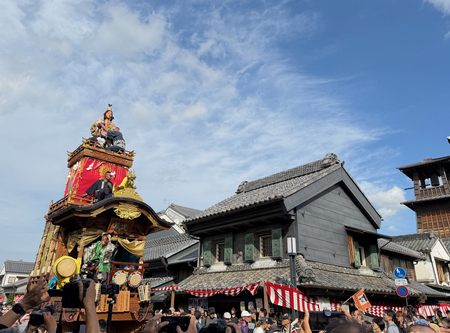 蔵造りの街並みを巡る山車=18日、川越市 埼玉県川越市で、秋の風物詩「川越まつり」が華やかに開催された。おはやしの音色が響き渡る蔵造りの街並みを豪華絢爛(けんらん)な山車が練り歩き、大勢の観光客や地元の家族連れを楽しませた。