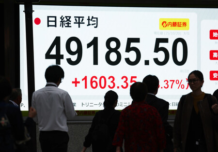 4万9000円を超え、史上最高値を更新した日経平均株価の終値を示すモニター=20日午後、東京都中央区 週明け20日の東京株式市場は、自民党と日本維新の会が連立政権の樹立で実質的に合意したことが好感され、全面高の展開となった。前週末の米国株高の流れも引き継ぎ、日経平均株価は大幅に反発。終値は前週末比1603円35銭高の4万9185円50銭と、9日に付けた史上最高値(4万8580円44銭)を上回り、初めて4万9000円台に乗せた。
