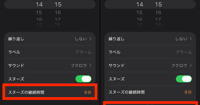 設定方法は、「時計」アプリ内の「アラーム」タブで設定したアラームをタップするなどし、編集画面を起動したら、スヌーズのスイッチがオンになっている状態で直下の「スヌーズの継続時間」欄に表示された初期値の「9分」をタップする。表示されるドラムロールUIを回転させ、1分〜15分の好きな値を選択すれば良い。
