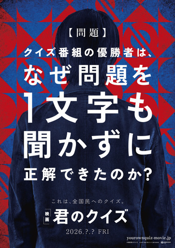 映り込む男の背中、突如押されるボタン。さまざまなシーンがフラッシュで映し出される中、「これは全国民へのクイズ」というメッセージが浮かび上がる。観るものすべてが「クイズの参加者」となる体感型映画『君のクイズ』。キャスト、スタッフ、公開日などは依然としてベールに包まれたまま。今後の情報解禁に注目だ。