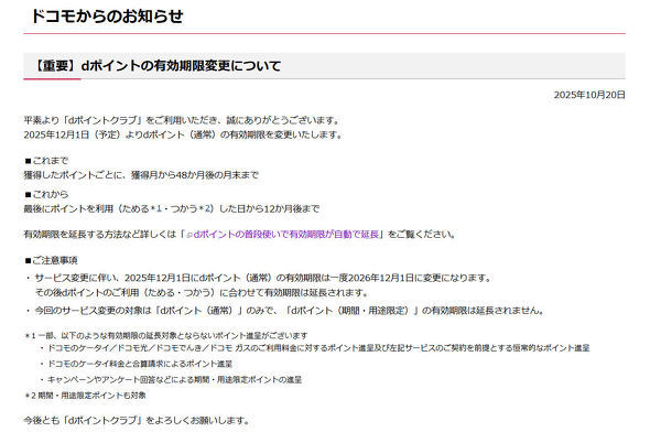 ¡¡¸½ºß¡¢d¥Ý¥¤¥ó¥È¤Î͸ú´ü¸Â¤Ï³ÍÆÀ·î¤«¤é48¥«·î¸å¤Î·îËö¤È¤Ê¤Ã¤Æ¤¤¤ë¤¬¡¢12·î°Ê¹ß¤Ï¡¢ºÇ¸å¤Ë¥Ý¥¤¥ó¥È¤ò¤¿¤á¤¿¤ê»È¤Ã¤¿¤ê¤·¤¿Æü¤«¤é12¥«·î¸å¤Þ¤Ç¤È¤Ê¤ë¡£º£²ó¤Î»ÅÍÍÊѹ¹¤Ëȼ¤¤¡¢2025ǯ12·î1Æü¤Ë¡¢d¥Ý¥¤¥ó¥È¤Î͸ú´ü¸Â¤Ï2026ǯ12·î1Æü¤ËÊѹ¹¤µ¤ì¤ë¡£