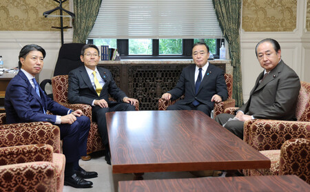 会談に臨む自民党の梶山弘志国対委員長(中央右)と立憲民主党の笠浩史国対委員長(同左)ら=22日午後、国会内 自民党の磯崎仁彦、立憲民主党の斎藤嘉隆両参院国対委員長は22日、国会内で会談し、高市早苗首相の所信表明演説を24日に行うことで大筋合意した。これに対する参院の各党代表質問は11月5、6両日に実施。衆院は23日の議院運営委員会理事会で日程を協議する。