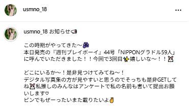 そして「デジタル写真集の方が見やすいと思うのでそっちも是非GETしてね。私推しのみんなはアンケートで私の名前も書いて提出お願いします。ピンでもぜーったいまた載りたいよ」と呼びかけた。