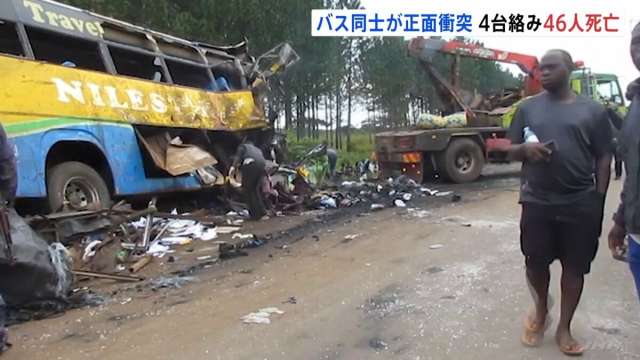 AP通信によりますと、22日、ウガンダの首都カンパラと北部の都市グルを結ぶ幹線道路で、バスが他の車を追い越そうとした際に対向車線を走ってきたもう1台のバスと正面衝突する事故がありました。付近を走っていた2台の車も巻き込まれたということです。