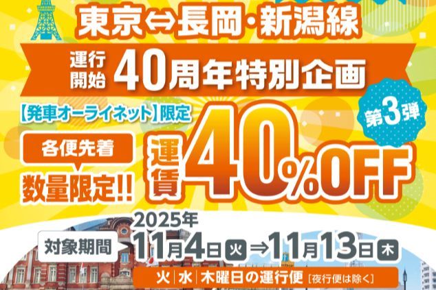 西武バスと新潟交通、越後交通は、東京〜長岡・新潟線の運行開始40周年特別企画第3弾として運賃40%引きを11月4日から11月13日まで実施する。