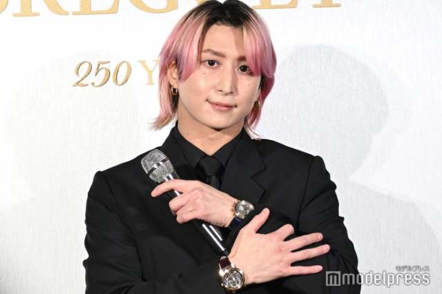 シックなブラックスーツを纏い登壇した佐久間。普段からブレゲの時計を愛用しているそうで、今年行われたスタジアムライブでは「メシドール」を着用していたことを告白。「ライブが3時間くらいあるんですけど、ライブパフォーマンスして、それでも耐えれる耐久性がある時計だなと。実用性がすごくある時計なんだなと改めて思いました」と話した。