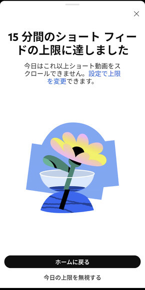 設定された時間制限に達すると、その日のショートフィードのスクロールが一時停止されたことを通知するメッセージが表示される。ただし、「今日の上限を無視する」をタップすれば視聴を再開できる。