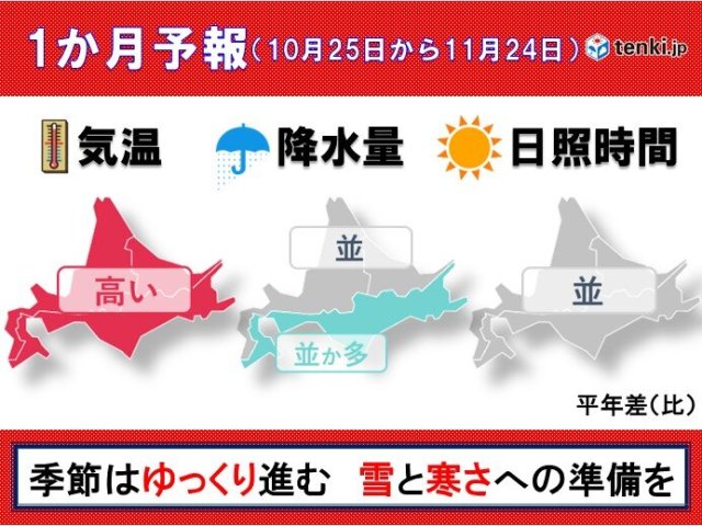 そして、今年のこの期間は気温が平年よりも高い予想のため、いったん季節の歩みとしては足踏み状態となり、本格的な冬への準備期間ともいえそうです。タイヤ交換の予定を入れたり、冬服の準備をしたり、雪や寒さへの準備を整えておきましょう。