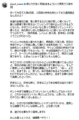 音楽ユニットCREAMのラッパー、Staxx T(スタックス・ティー)が23日までにインスタグラムを更新。肺気胸を発症し、入院して手術を受けたことを報告した。