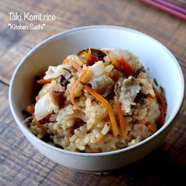 豚こま肉、にんじん、塩昆布などを米と一緒に炊飯器に入れて、炊飯すればできあがり。豚肉をたっぷり入れるのがポイントです。
