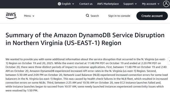 米Amazon傘下のAmazon Web Services(AWS)は10月22日(米太平洋時間)、19日から20日にわたって続いた大規模障害の概要と対策をまとめ、謝罪するWebページを公開した。