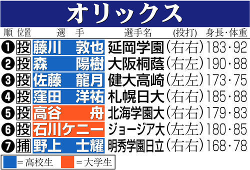 オリックスは外れ1位で延岡学園(宮崎)・藤川敦也投手(3年)を指名し、交渉権を獲得した。