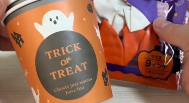 今回用意したのは、セリアで販売されている風船と紙コップ。いずれもハロウィーンシーズン向けに、オバケやジャック・オー・ランタンがデザインされています。