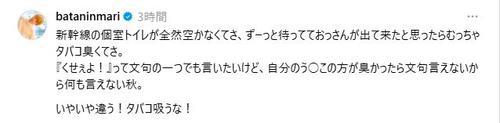 おばたのお兄さんは「新幹線の個室トイレが全然空かなくてさ、ずーっと待ってておっさんが出て来たと思ったらむっちゃタバコ臭くてさ」と全車両禁煙にもかかわらず、トイレ内でたばこを吸っていたとみられる乗客の行為について書き出した。
