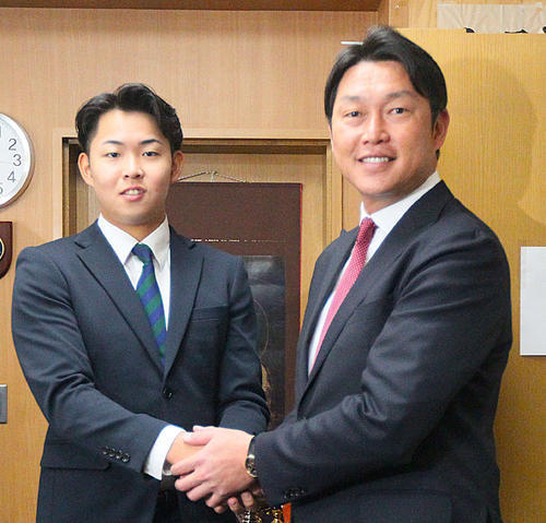 スタートダッシュを誓った。広島ドラフト1位の仙台大・平川蓮外野手(21=札幌国際情報)が24日、宮城・柴田町の同校で、新井貴浩監督(48)から指名あいさつを受けた。玄関前で同監督を出迎え、「タクシーの中でもオーラを放っていた」と名球会入りした貫禄に目を輝かせた。