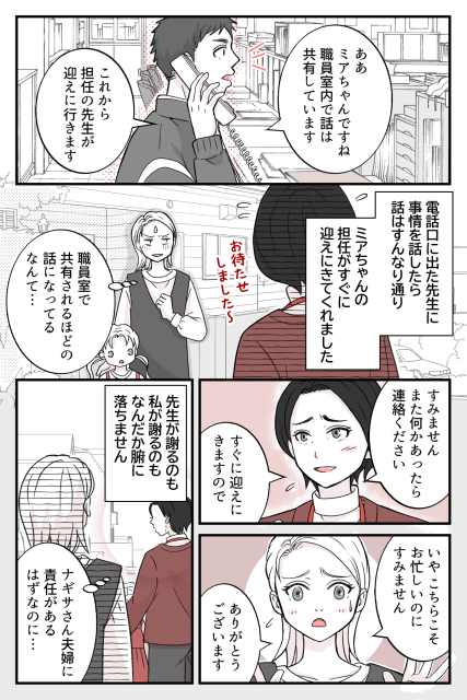 電話口に出た先生に事情を話したら、話はすんなり通り、ミアちゃんの担任がすぐにミアちゃんを迎えにきてくれました。先生が私に謝るのも気の毒だし、私が謝るのもなんだか腑に落ちません。本来なら、すべてはナギサさん夫婦に責任があるはずなのに……。