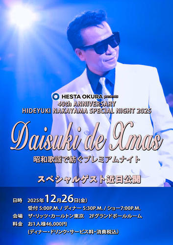 タレントの中山秀征(58)が12月26日に、自身初となるディナーショーをザ・リッツ・カールトン東京で開催する。「HESTA大倉 presents 40th ANNIVERSARY HIDEYUKI NAKAYAMA SPECIAL NIGHT 2025 『Daisuki de Xmas』昭和歌謡で紡ぐプレミアムナイト」と題し、近日発表予定のスペシャルゲストとともに、トークや昭和歌謡を披露する。