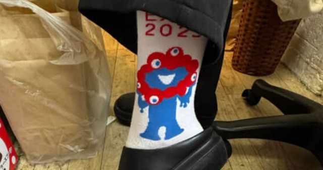 この日に履いていたのは、白地に大きな「ミャクミャク」と「EXPO2025」のロゴが入った靴下。ぱっと見で目をひく、なかなか派手なデザインです。