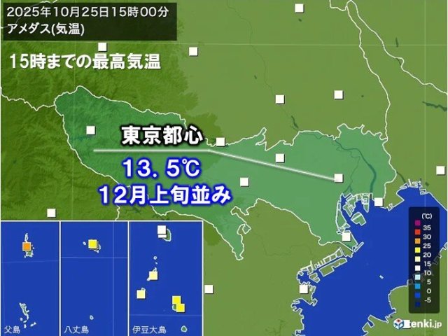 今日25日の東京都心は朝から厚い雲に覆われ、弱い雨が降ったりやんだりしています。気温は朝からほとんど上がらず、12℃から13℃台で経過し、午後3時までの最高気温は13.5℃と12月上旬並みでした。今シーズンこれまでで一番低い最高気温です。日差しがないうえに、弱いながらも北よりの風がヒンヤリして、冬物のコートが欲しくなるくらいでした。