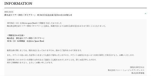 公式サイトでは「10月26日(日)広島Live space Reedにて開催を予定しておりました崎山蒼志弾き語りツアー2025『ダイアリー』公演は、体調不良により公演を見合わせさせて頂くこととなりました」と発表。