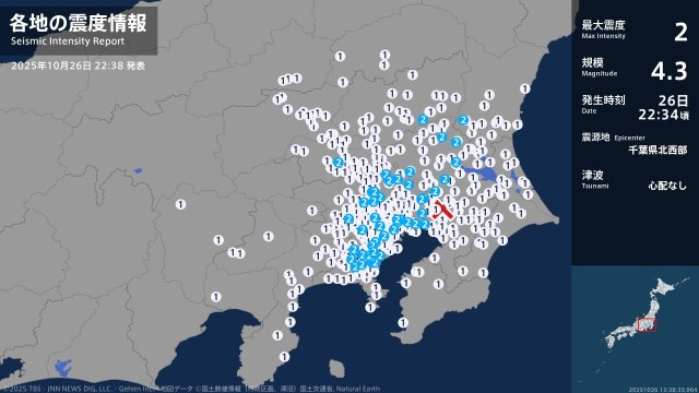 気象庁によりますと、震源地は千葉県北西部で、震源の深さはおよそ80km、地震の規模を示すマグニチュードは4.3と推定されます。