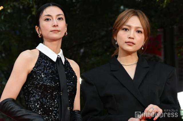 柴咲はブラックのスパンコールが輝くノースリーブドレスにネクタイを締め、クールなスタイリングを披露。川口もオーバーなジャケットを着こなしたモードなテイストをまとい、圧巻の美しさを放っていた。