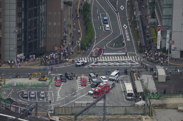 安倍晋三元首相が銃撃された現場=奈良市の近鉄大和西大寺駅前で2022年7月8日午後0時8分、本社ヘリから 2022年7月、安倍晋三元首相(当時67歳)が参院選の応援演説中に銃撃され死亡した事件の初公判が28日、奈良地裁で開かれる。公衆の面前で元首相が凶弾に倒れた前代未聞の事態に、社会は震撼(しんかん)した。