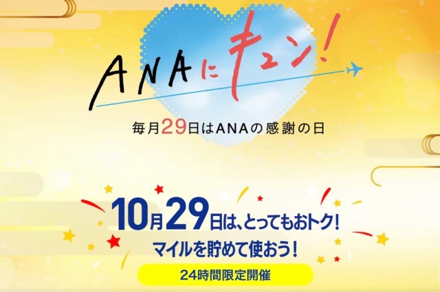 ANAグループは、毎月29日に実施している「ANAにキュン!」に合わせ、10月29日に割引クーポンの配布やホテルの割引プランを設定する。