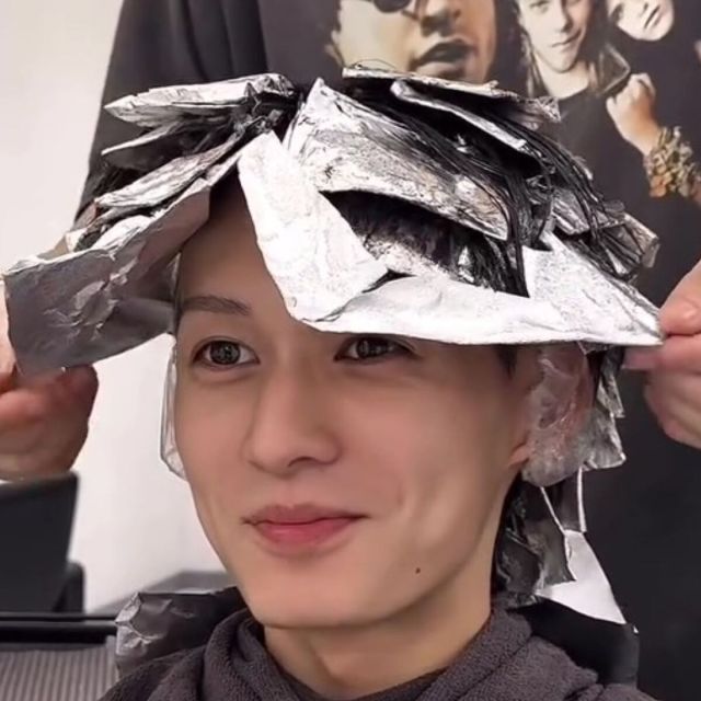 まずは毛流れセンターパートにするため、髪を前下がり気味にカット。次にカラーをしてメッシュを入れていきます。途中頭にたくさんアルミホイルが付く場面もありましたが、果たしてどのような仕上がりになるのでしょうか……?