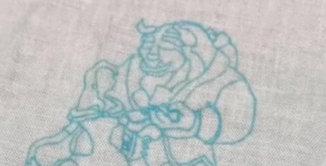 それから数週間後、練習の成果が現れはじめ、いよいよ本番の刺しゅうをスタート。当初は、ディズニー映画『美女と野獣』の刺しゅうをユニクロのスウェットシャツにそのまま入れる予定でしたが、よく伸びる素材だったため、1度ワッペンにして貼り付けることに。