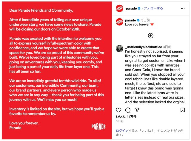 アメリカ・ニューヨーク発の下着ブランド「パレード(Parade)」が現地時間10月28日をもってサイトを閉鎖すると発表した。立ち上げから6年でブランドの活動に終止符を打つ。
