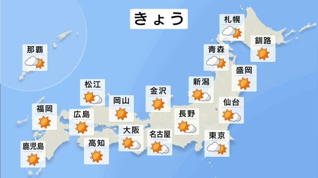 きょうは移動性高気圧に覆われて、晴れて青空が広がる所が多くなりそうです。寒気の影響できのうから雪になっている北海道も次第に雪は止む見込みです。東京は午前中、曇りでしたが、午後は晴れて日差しが届くでしょう。