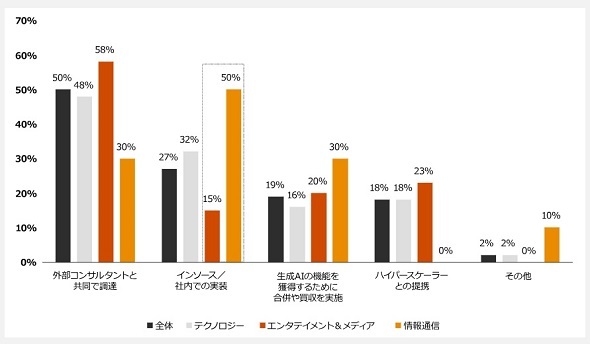 具体的には、生成AIのユースケースを「外部コンサルタントと共同で調達」と回答した企業の割合は全体の50%。内訳はテクノロジー企業48%、エンターテインメント&メディア企業58%、情報通信企業30%だ。