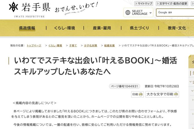岩手県の公式サイト内で公開されていた『いわてでステキな出会い「叶えるBOOK」〜婚活スキルアップしたいあなたへ』という、婚活を行う男女を支援するページに批判が殺到している。