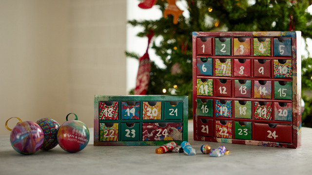 【写真】見て、遊んで、ときめく…紙芝居も人形劇もできる可愛すぎるボックスはこれ! 今年のテーマは“準備のひととき”を豊かにすること。作家やつくり手とともに仕上げたラインナップが並ぶ。なかでも注目は、鹿児島の知的障がい者支援施設「しょうぶ学園」の利用者が描いたアートを用いたアドベントカレンダーとホリデーオーナメント缶。サンタクロースやコイン型チョコなどの菓子が入っており、日ごとに窓を開けながらクリスマスまでを楽しめる。アドベントカレンダーは24日間タイプ(3600円)と7日間タイプ(1800円)の2種類を展開する。
