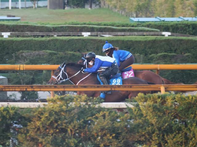 オーサムリザルトのすぐ後ろを走っていたのが、同厩舎でJBCスプリントに出走予定のママコチャ。こちらも時計は4F54.8〜3F39.1〜2F24.9〜1F12.1秒と目立たない数字だったが、動きは軽快だった。