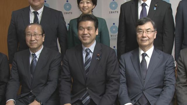 午後3時過ぎ、坂口特任教授と北川特別教授が文科大臣室に入ると、松本大臣をはじめ、文科省幹部らが大きな拍手で出迎えました。