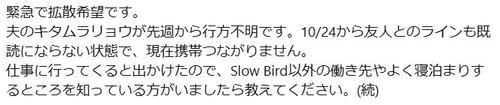 「緊急で拡散希望です。夫のキタムラリョウが先週から行方不明です。10/24から友人とのラインも既読にならない状態で、現在携帯つながりません」と書き出した上で「仕事に行ってくると出かけたので、Slow Bird以外の働き先やよく寝泊まりするところを知っている方がいましたら教えてください」と呼びかけた。